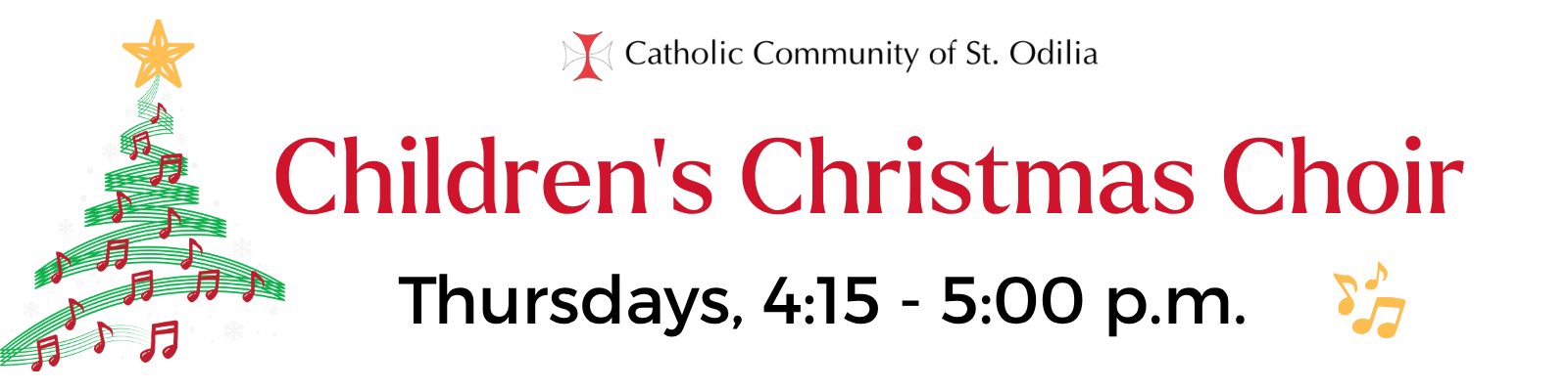 St. Odilia invites students in grades 2-8 to participate in singing the special music of the Christmas Season at the 4:00 p.m. Christmas Eve Mass. Rehearsals begin on Thursday, October 23, from 4:15- 5:00 p.m. Email Kathy Lopac, Director with any questions at: [email protected] *Note: the day of rehearsals has changed from previous years.*