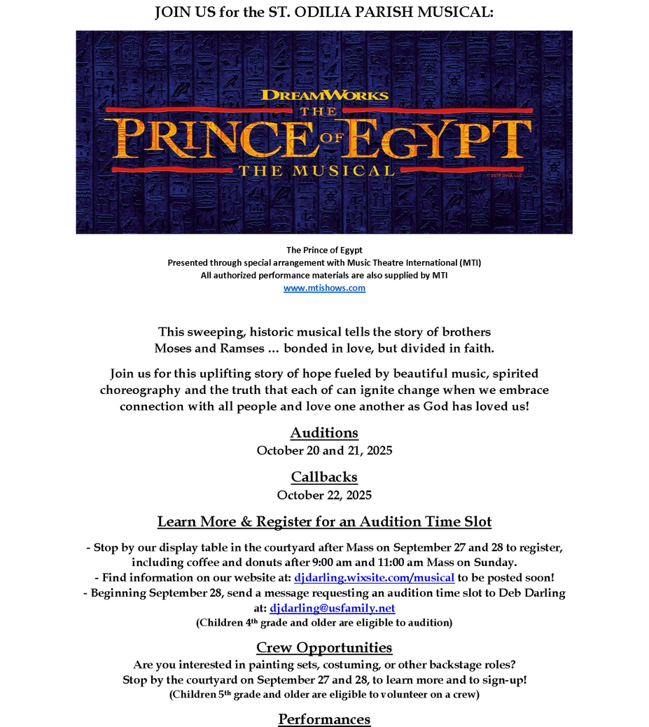The MISSION of the St. Odilia Parish Musical is to share the good news of God's unending love and to spread the message of Jesus Christ, by sharing Biblical and life-changing stories through theater and song.